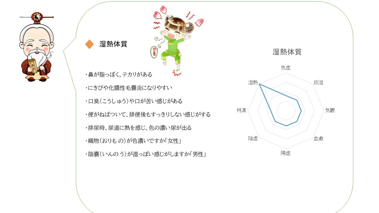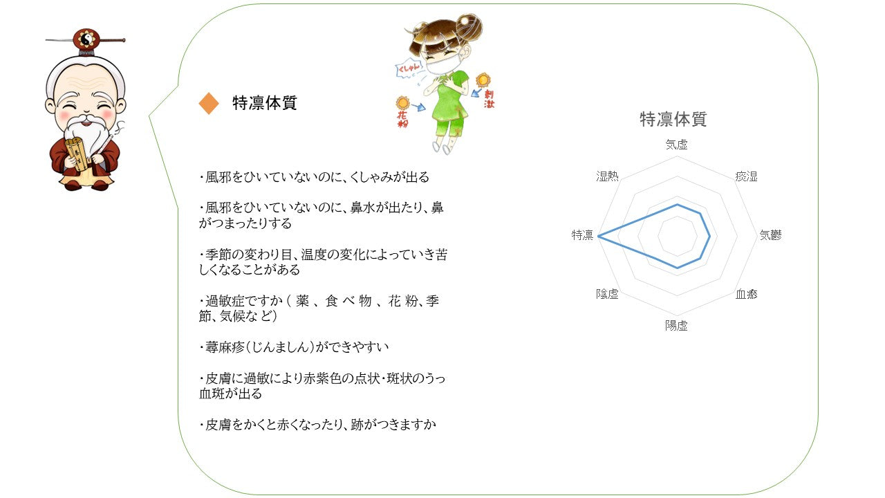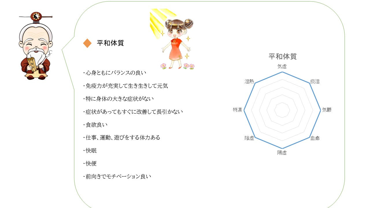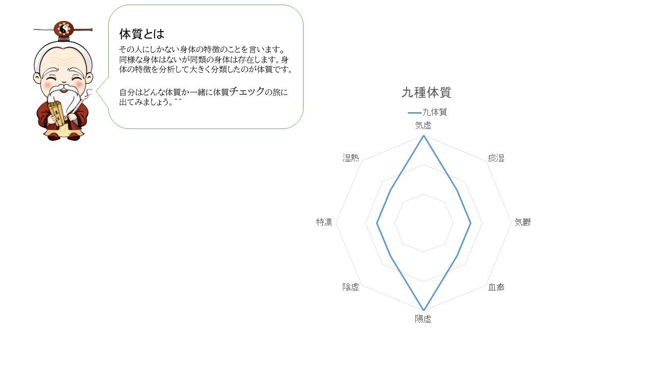 その人にしかない身体の特徴のことを言います。同様な身体はないが同類の身体は存在します。身体の特徴を分析して大きく分類したのが体質です。自分はどんな体質か一緒に体質チェックの旅に出てみましょう。^^
